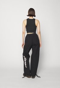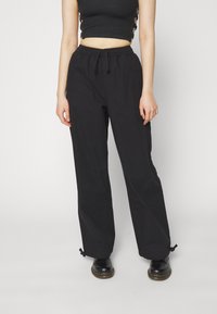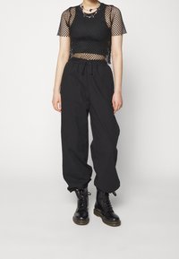 Crop top en maille noire à manches courtes, pantalon noir ample et bottes noires à lacets. Le mannequin s'appuie sur une chaise de bureau orange et noire.