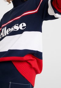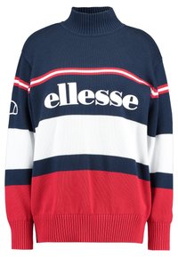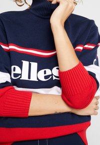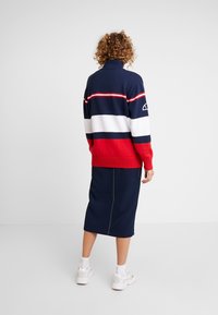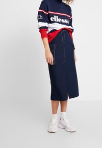 Femme portant un pull à rayures bleu marine, rouge et blanc avec le texte « ellesse » et une jupe bleu marine avec de grandes poches avant et des coutures blanches.