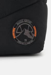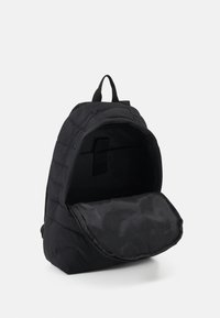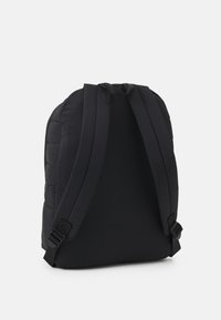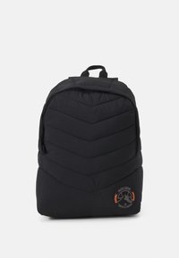 Sac à dos noir en nylon avec un motif chevron matelassé, une structure rembourrée, une poignée supérieure et un écusson rond avec logo sur le côté.