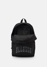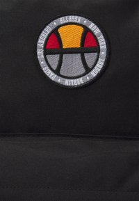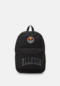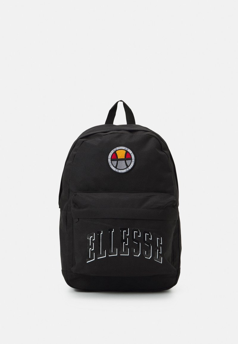 Sac à dos noir avec poche frontale zippée, texte "ELLESSE" sur la poche, et logo circulaire au-dessus de la poche arborant des couleurs jaune, rouge et gris.