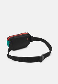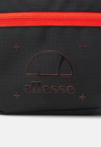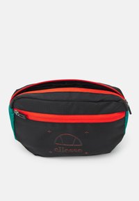 Sac banane en tissu noir avec une fermeture éclair rouge, des panneaux latéraux verts, un mousqueton et un logo Ellesse embossé à l'avant.