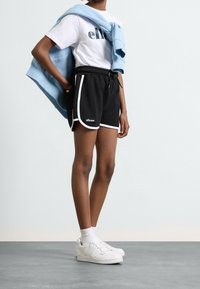 Personne portant un short de sport noir avec un bord blanc, des chaussettes blanches et des baskets blanches, debout sur un sol gris devant un fond clair uni.