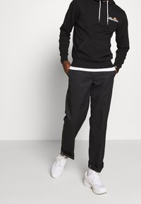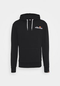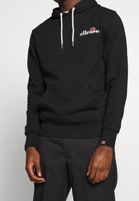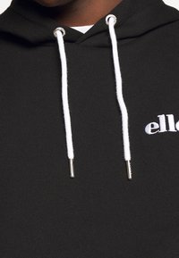 Homme portant un sweat à capuche noir ellesse avec des cordons blancs et un pantalon noir, debout devant un fond clair uni.