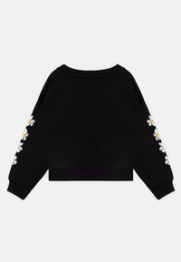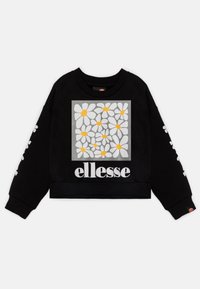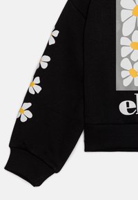 Sweat-shirt court noir avec un imprimé de marguerite blanche dans un carré avec des centres jaunes, et le logo "ellesse" en blanc sur le devant.