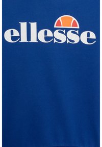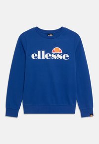 Sweat-shirt bleu en tissu doux avec un logo "ellesse" blanc et un graphique coloré de demi-soleil au-dessus. Poignets et ourlet côtelés.
