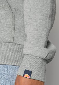 Personne portant un sweat à capuche gris ellesse avec des cordons blancs et un jean bleu clair, debout les mains détendues le long du corps.