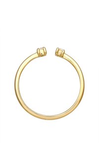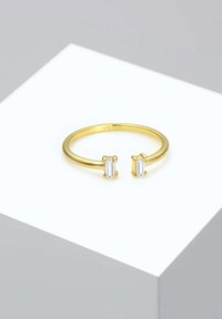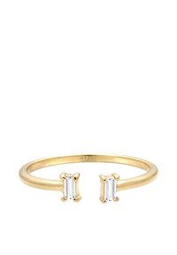 Main avec une bague dorée minimaliste ouverte ornée de deux petites pierres rectangulaires transparentes sur l'annulaire, sur fond blanc.