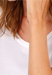 Femme à la peau claire et aux cheveux bruns, portant une chemise blanche, levant son bras droit pour couvrir partiellement son visage.
