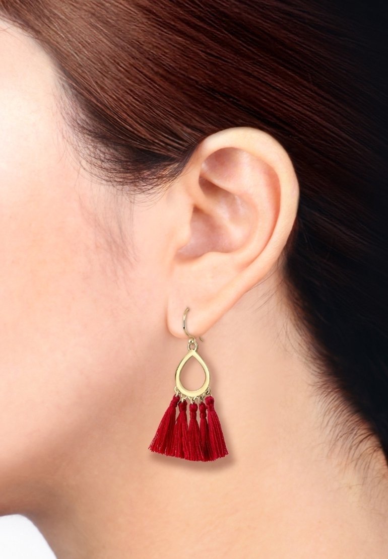 Oreille avec boucle d'oreille en forme de goutte d'or ornée de cinq pompons rouges suspendus en bas.