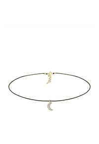 Cou avec collier ras de cou en cordon noir orné d'un petit pendentif en forme de croissant de lune doré porté sur un haut noir à encolure carrée.