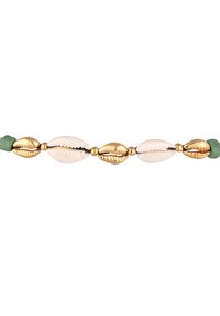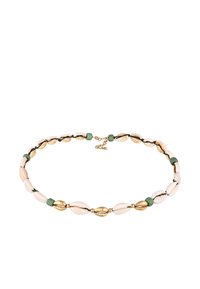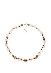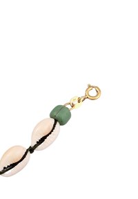Femme portant une chemise blanche ouverte, un haut gris côtelé et un collier ras du cou composé de perles de coquillage alternant blanc et or, avec une perle verte.