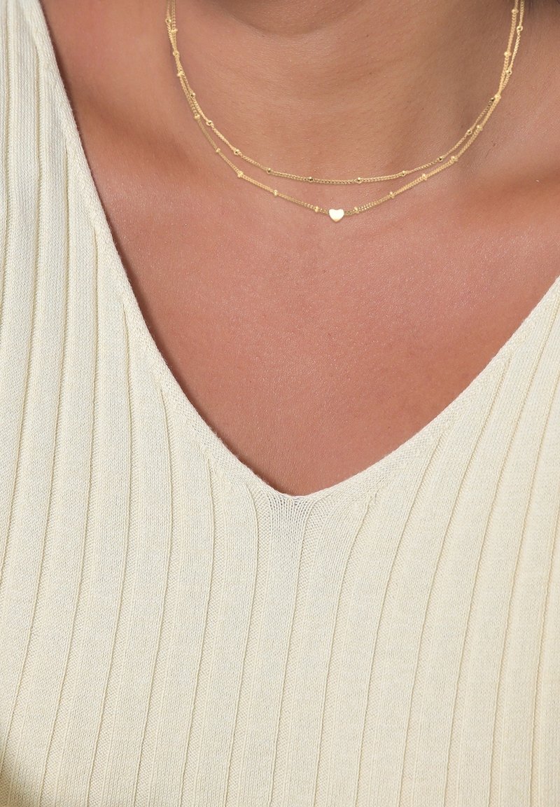 Deux délicats colliers en or autour du cou, l'un avec de petites perles et l'autre avec un petit pendentif en forme de cœur, assortis à un haut crème côtelé à col en V.