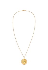 Collier délicat en chaîne d'or avec pendentif rond présentant un design en relief d'une femme versant de l'eau, symbolisant le signe du zodiaque Verseau.