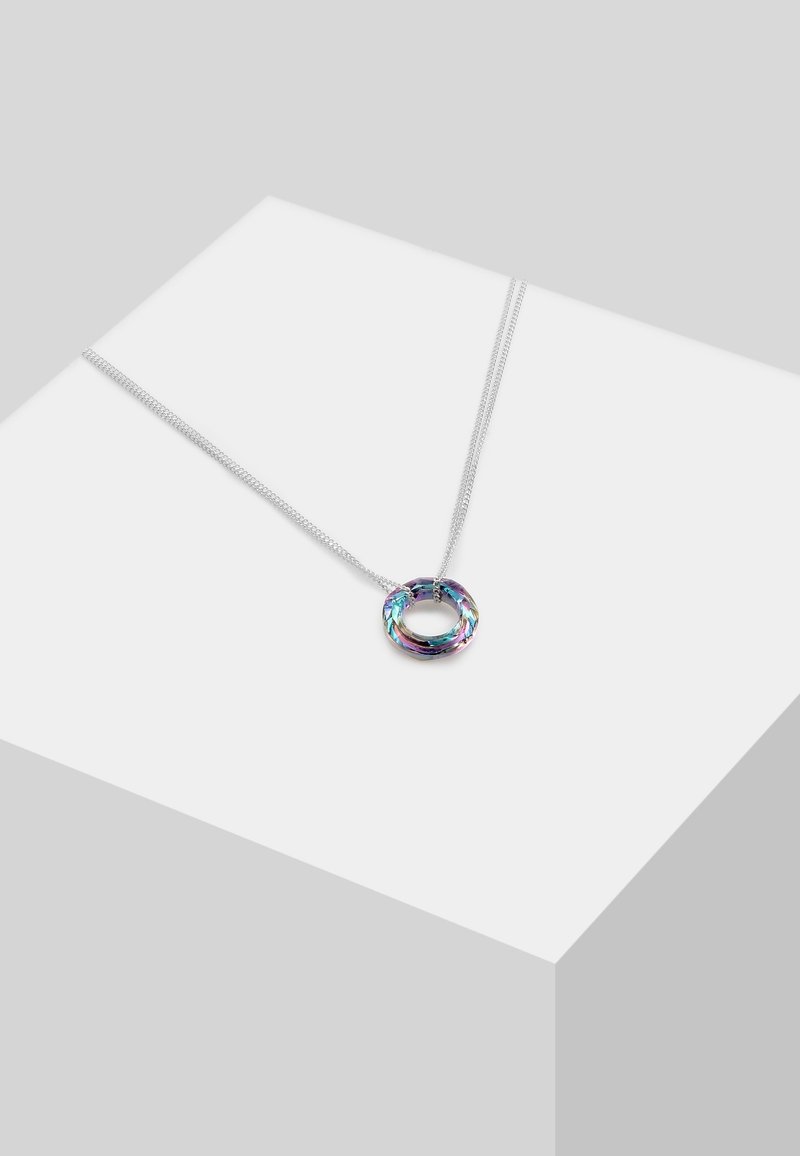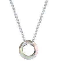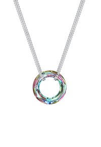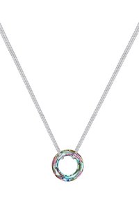 Collier en chaîne argentée avec un pendentif circulaire irisé multicolore, présenté sur une surface géométrique blanche.