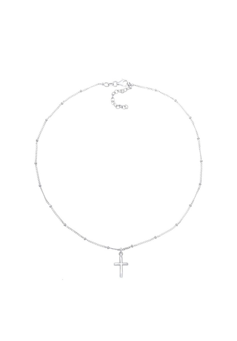 Collier délicat en chaîne d'argent avec de petites perles et un pendentif central en forme de croix, doté d'une fermeture à boucle réglable.
