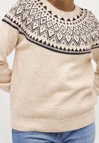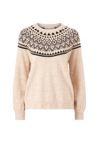 Pull beige avec un motif géométrique noir de losanges et de triangles sur la poitrine et les épaules, porté avec un jean en denim bleu.