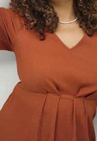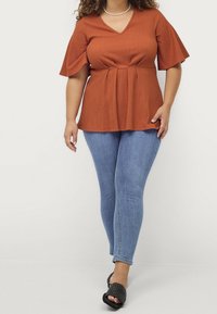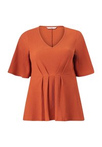 Haut couleur rouille avec encolure en V, manches courtes évasées et taille froncée. Tissu texturé avec une coupe décontractée, assorti à un jean bleu.
