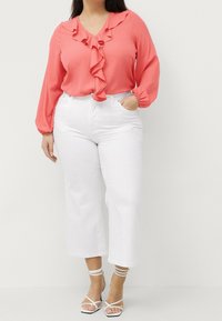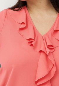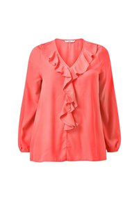 Blouse corail avec un col en V à volants, manches longues bouffantes et coupe ample. Confectionnée dans un tissu lisse, conçue pour le confort et la facilité à porter.