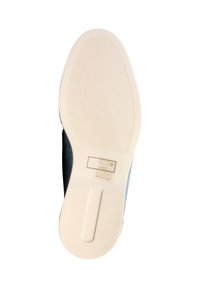 Mocassin en daim bleu marine avec un bout arrondi, un petit accent décoratif et une semelle en contraste marron. Texture lisse avec des détails de couture subtils.