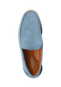 Mocassin penny en daim bleu clair avec détails cousus et semelle en caoutchouc noire, présenté en profil latéral sur fond blanc.