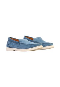 Mocassin bleu en daim à enfiler avec semelle blanche, coutures apparentes le long du bord supérieur et petit talon sur fond blanc.