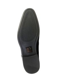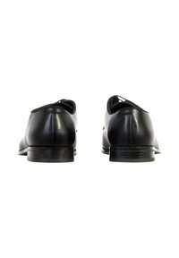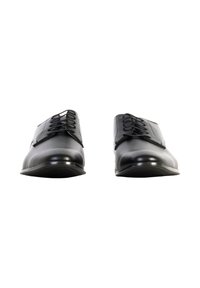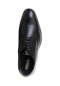 Chaussure habillée pour homme en cuir noir avec laçage fermé, finition lisse, petit talon et bout pointu, vue de profil sur fond blanc.