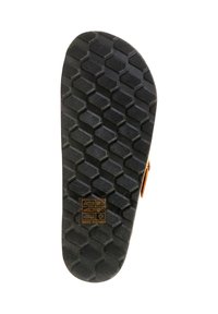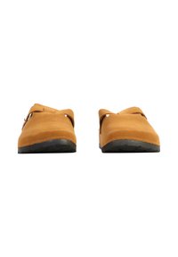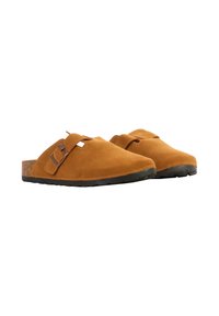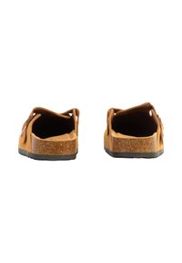 Mule en daim marron à enfiler avec une bride ajustable à boucle, une semelle intérieure en liège et une semelle extérieure en caoutchouc noir, présenté de profil sur fond blanc.