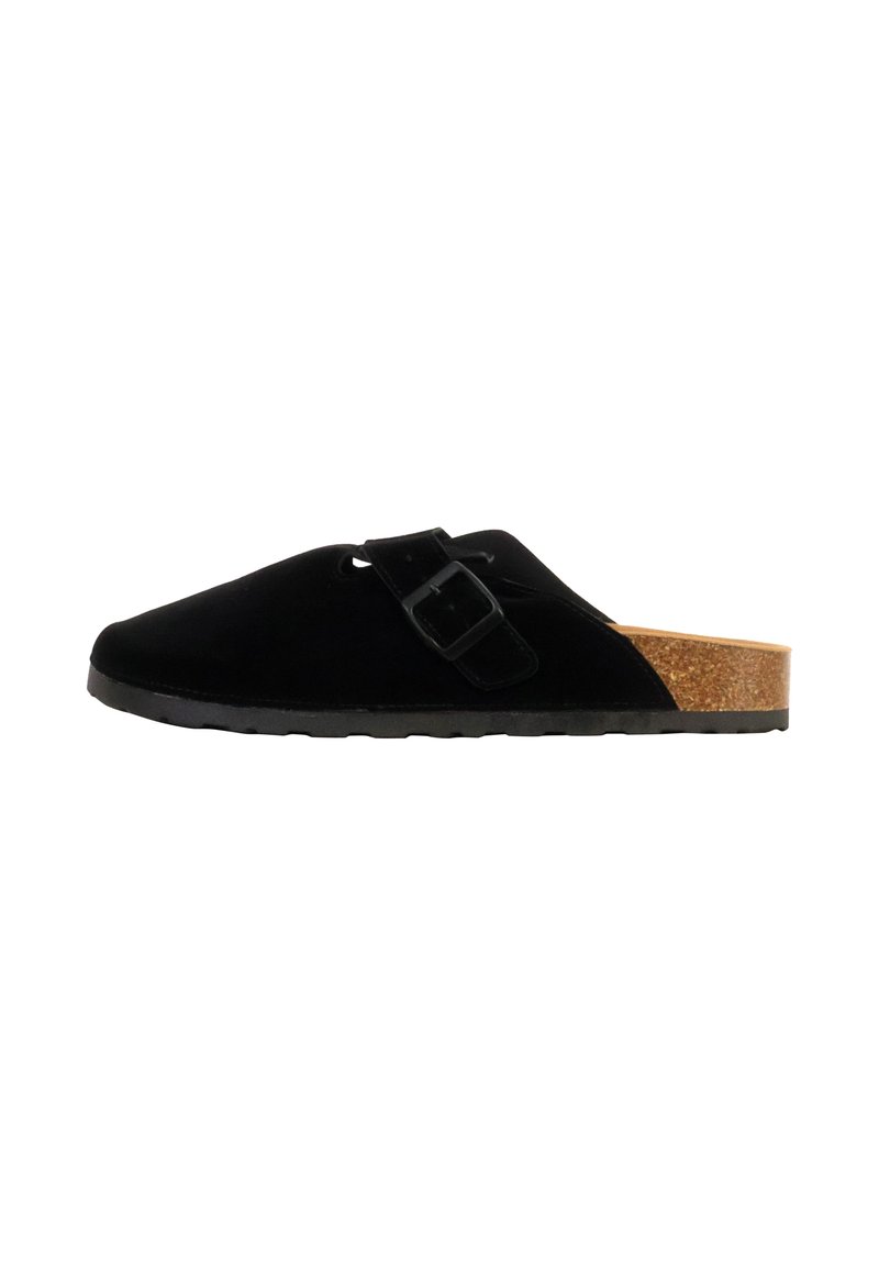 Sabot noir à enfiler avec bride à boucle réglable, semelle intérieure en liège et semelle extérieure en caoutchouc noir, présenté de profil sur fond blanc.