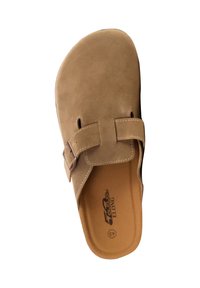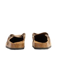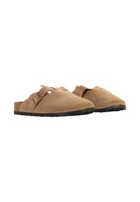 Sabot marron en daim à enfiler avec sangle réglable à boucle, semelle intérieure en liège et semelle extérieure en caoutchouc noire, vu de côté.