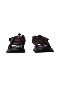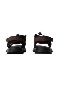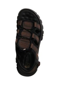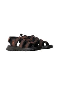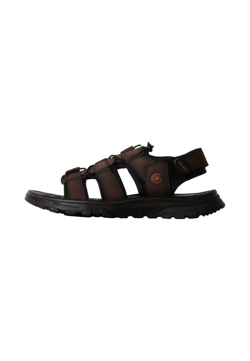 Sandale outdoor en cuir marron pour homme avec lanières ajustables et semelle noire amortissante, conçue pour un usage décontracté et confortable.