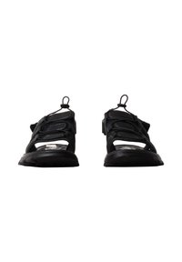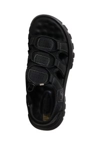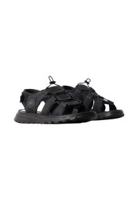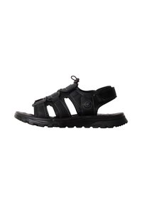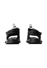 Sandale de sport noire pour homme avec bout ouvert, sangles réglables, semelle coussinée et une languette au talon pour un enfilage facile.