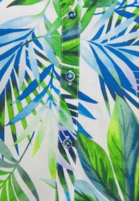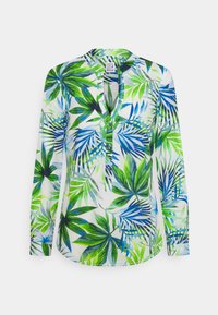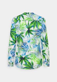 Blouse à manches longues en tissu léger, présentant un imprimé de feuilles tropicales en vert et bleu. Détails notables comprennent un décolleté en V et une patte de boutonnage.