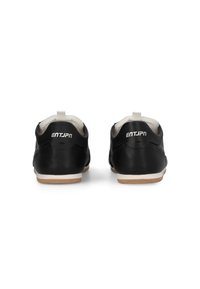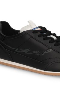 Baskets basses noires à lacets, avec languette de tirage blanche, motif latéral discret et semelle marron clair sur fond blanc.