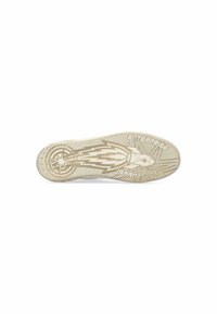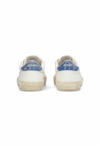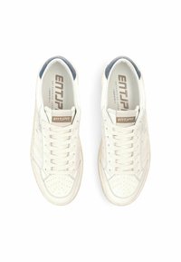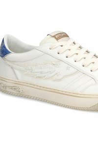Baskets basses couleur écru avec semelle beige clair, motif latéral en forme de plume, lacets et languette de talon bleu texturée.
