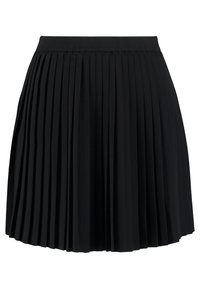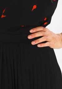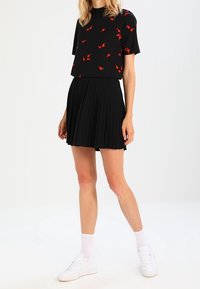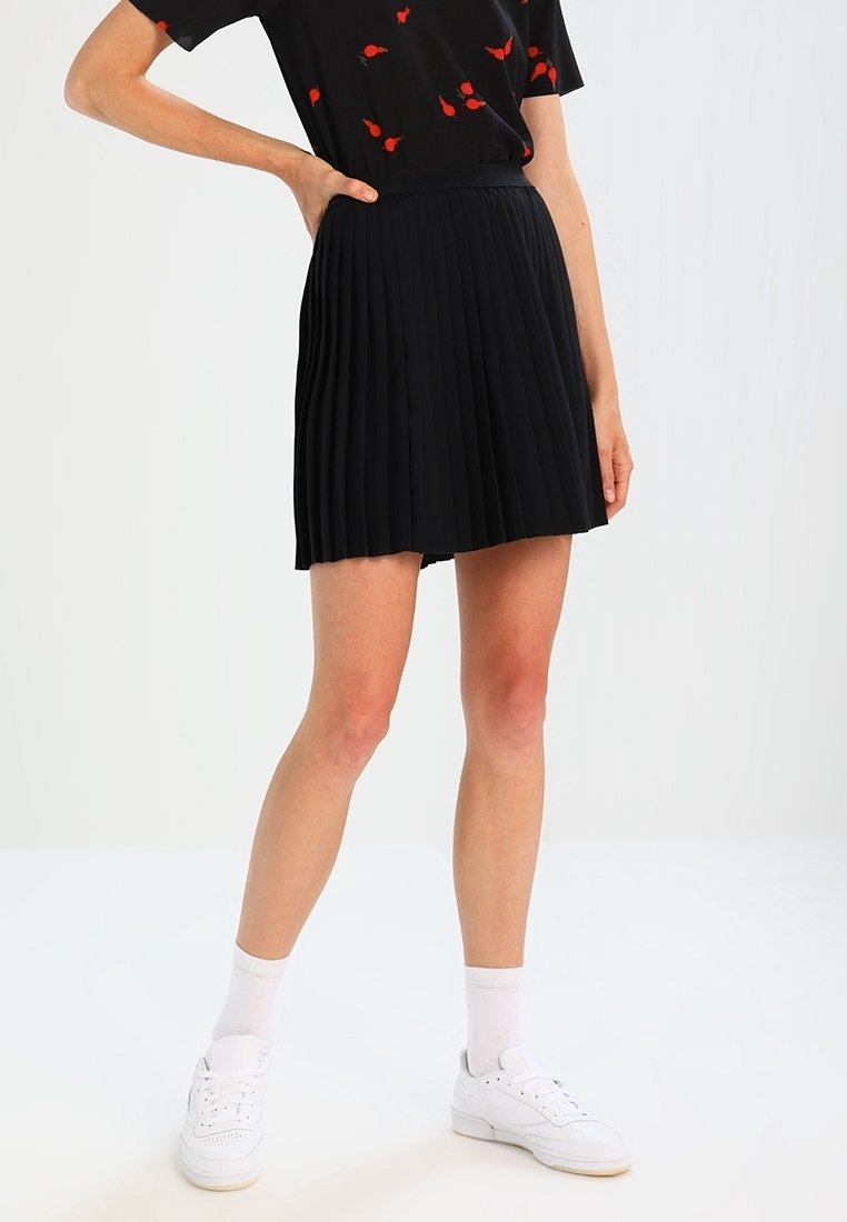 Femme portant une mini-jupe plissée noire, un t-shirt noir avec un motif rouge, des chaussettes blanches et des baskets blanches, debout avec une main sur la hanche.