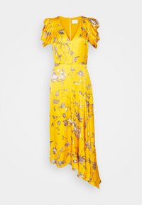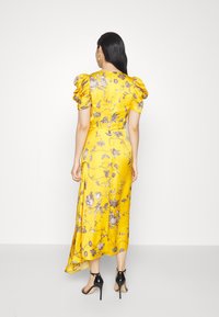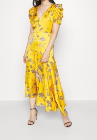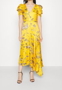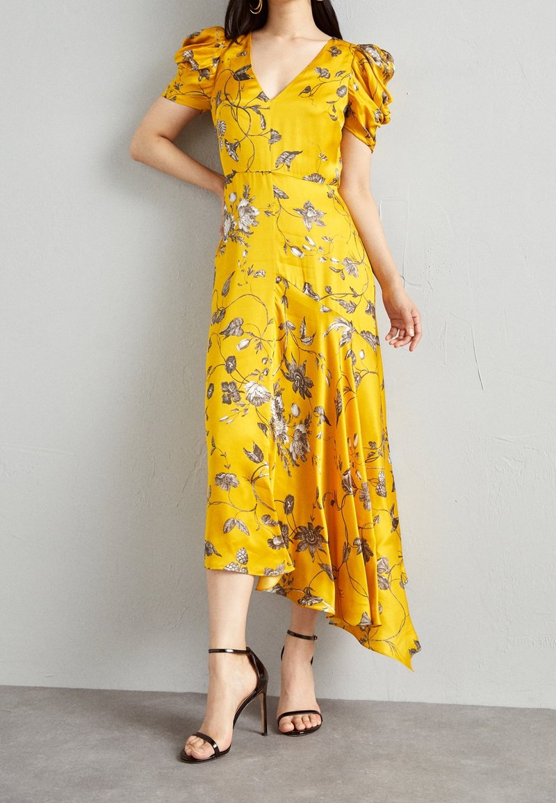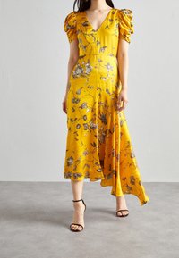 Femme portant une robe midi jaune fleurie avec des manches bouffantes et des sandales à talons hauts noires, debout contre un mur gris.
