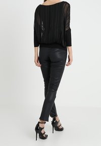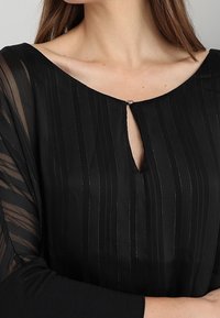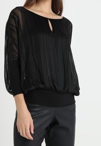 Femme portant un chemisier noir transparent rayé avec un col en trou de serrure et des poignets ajustés, associé à un pantalon noir sur un fond clair.