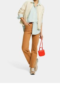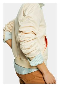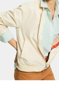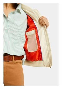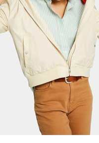 Personne portant une veste beige zippée sur une chemise à rayures vertes et un pantalon marron, une main reposant sur le dos.