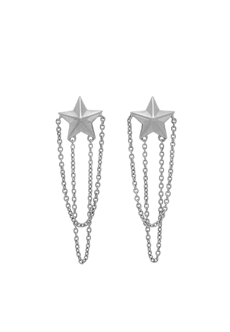 Boucles d'oreilles en forme d'étoile argentée avec trois chaînes délicates suspendues à chaque étoile, présentées sur un fond blanc uni.