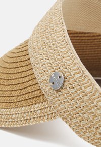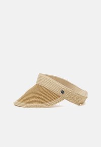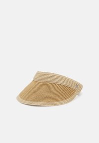 Visière de soleil en paille tissée beige avec large bord et bordure claire, conçue pour l'ombre et la respirabilité.