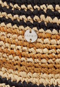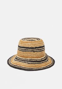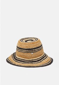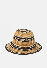 Chapeau seau en paille tissée avec des rayures horizontales alternées noir et naturel beige, et un bord légèrement évasé sur un fond blanc.