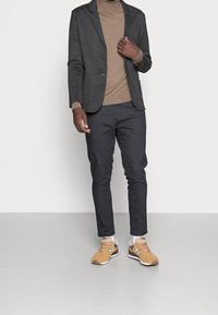 Chinos gris foncé à coupe ajustée, avec une taille plate, une texture lisse et des poches latérales, assortis à des baskets couleur tan.