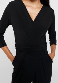 Combinaison noire avec un col croisé, manches courtes, taille élastique et jambes fuselées. Associée à des sandales à talons blocs marron.