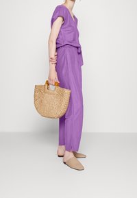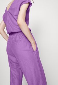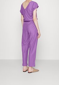 Combinaison violette en tissu doux, avec un col en V, des manches courtes, une ceinture nouée à la taille et des jambes fuselées. Portée avec des mules beige.