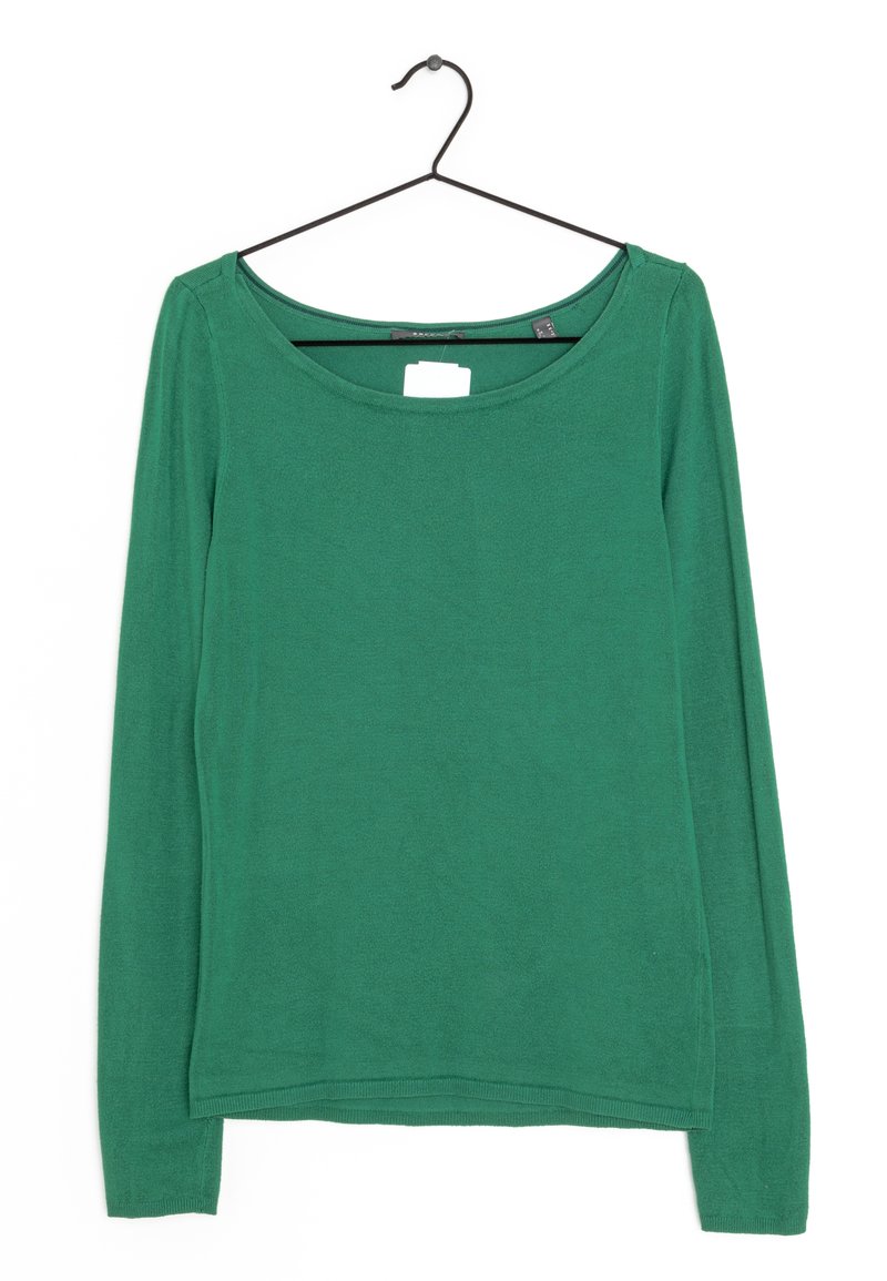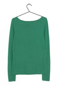 Haut en maille à manches longues vert avec un large col rond, accroché sur un cintre en fil métallique noir sur un fond blanc.