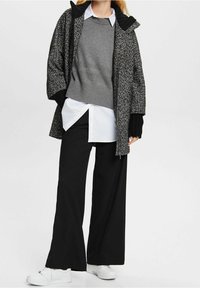 Femme portant un pull gris ample en maille à manches larges sur une chemise blanche à col, associée à un pantalon noir, tenant les manches de son pull.