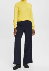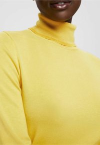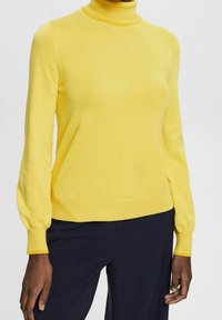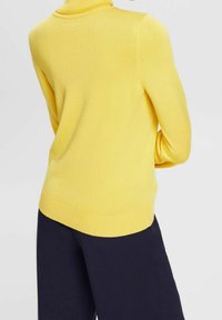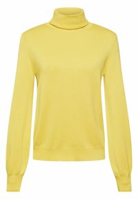 Pull à col roulé jaune, fabriqué en maille fine. Dispose de manches longues et fuselées ainsi qu'une coupe ajustée. Texture lisse, détails minimaux.