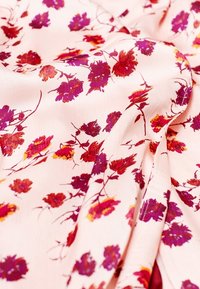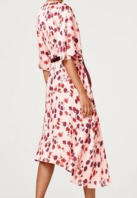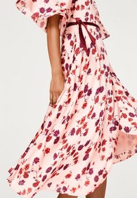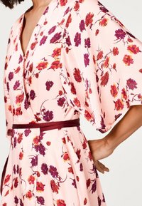 Robe florale rose avec un design croisé, dotée de manches courtes et d'une ceinture assortie. Le tissu est léger avec des fleurs rouges foncées et violettes éparpillées.