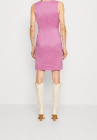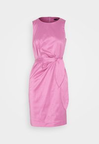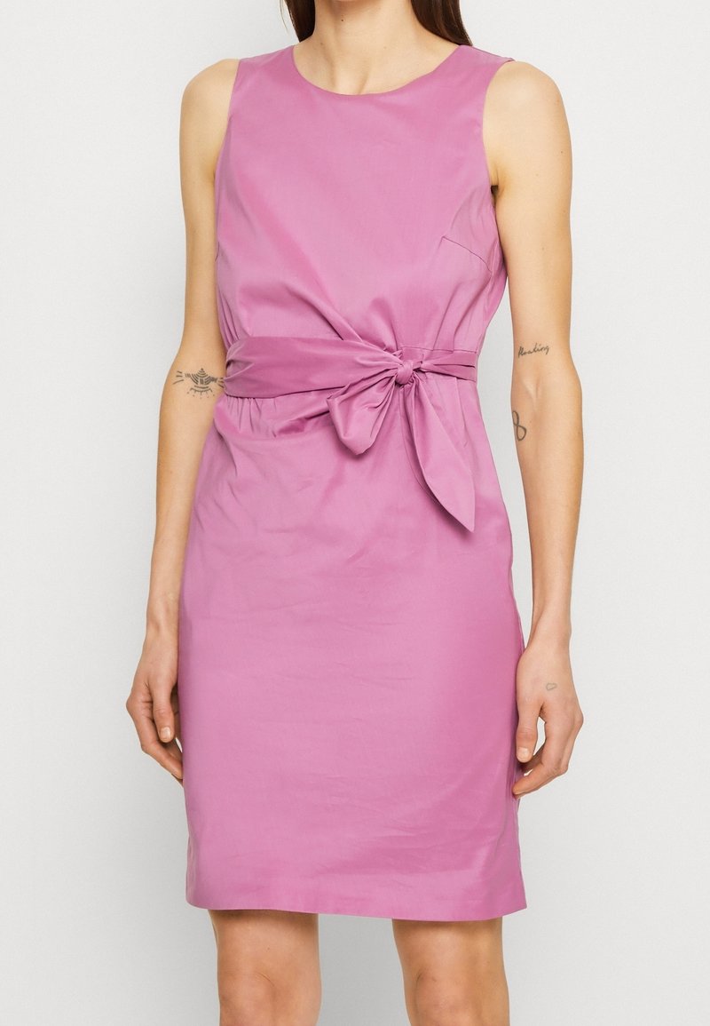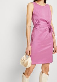 Robe rose jusqu'aux genoux en tissu lisse, avec un col rond et un détail de taille nouée pour une silhouette ajustée.