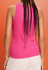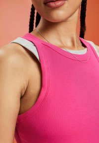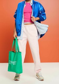 Débardeur rose à côtes avec des bretelles grises, associé à un pantalon de survêtement rose clair avec une poche latérale et un subtil détail brodé. Sac fourre-tout vert.